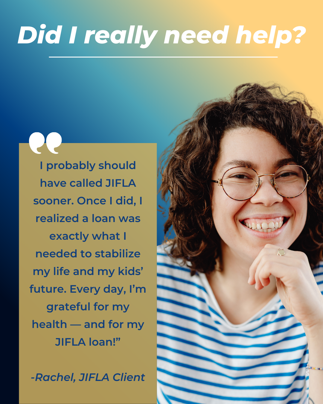 When a close friend mentioned JIFLA, Rachel hesitated—she’d never thought of asking for help. But the process was respectful and confidential, and the interest-free loan allowed her to consolidate medical debt into one manageable monthly payment. No more juggling due dates' The stress finally lifted, and she could focus on recovery and her kids instead of bills. JIFLA didn’t just help Rachel pay off debt—she now had breathing room, dignity, and a path forward,